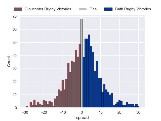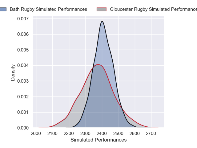 Each club has a rating and a rating deviation (similar to a Glicko rating), and expected performances can be generated. This allows for simulated matches and spreads like the ones below.