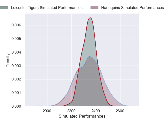 Each club has a rating and a rating deviation (similar to a Glicko rating), and expected performances can be generated. This allows for simulated matches and spreads like the ones below.