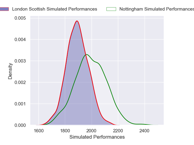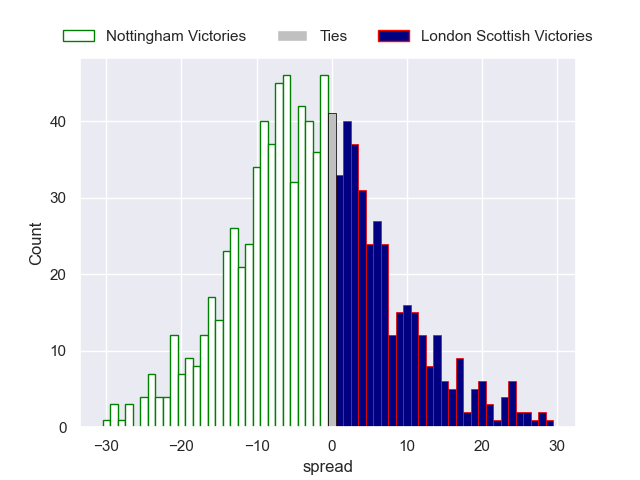 Each club has a rating and a rating deviation (similar to a Glicko rating), and expected performances can be generated. This allows for simulated matches and spreads like the ones below.