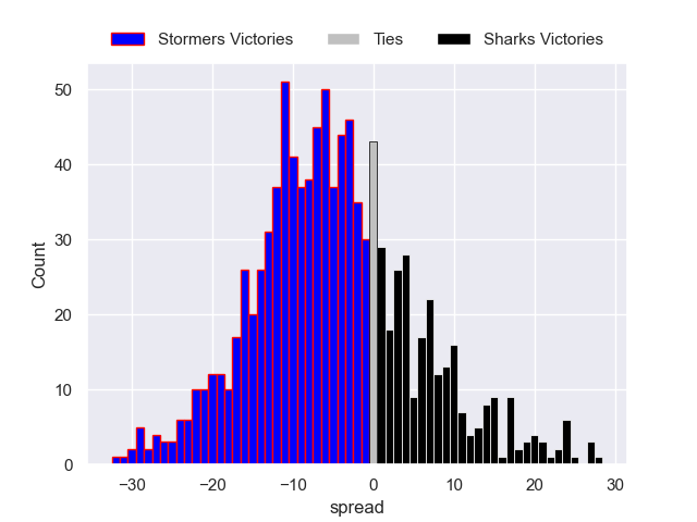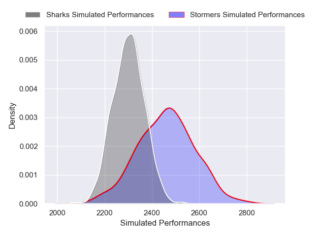 Each club has a rating and a rating deviation (similar to a Glicko rating), and expected performances can be generated. This allows for simulated matches and spreads like the ones below.