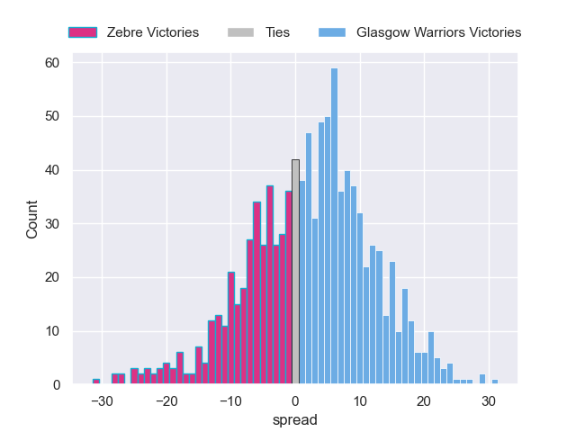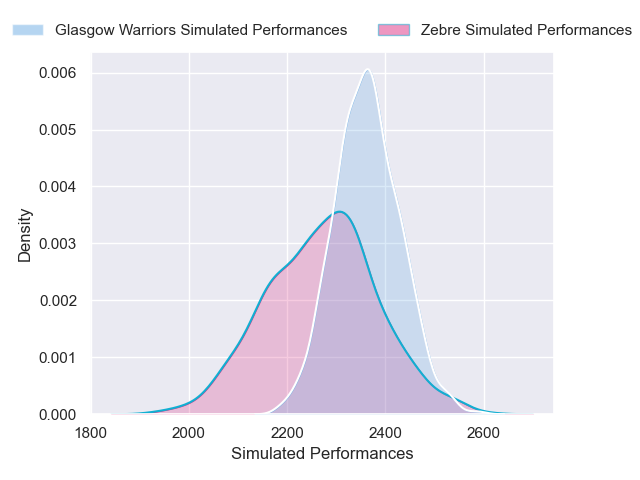 Each club has a rating and a rating deviation (similar to a Glicko rating), and expected performances can be generated. This allows for simulated matches and spreads like the ones below.
