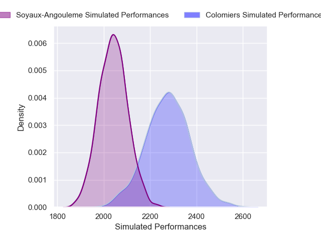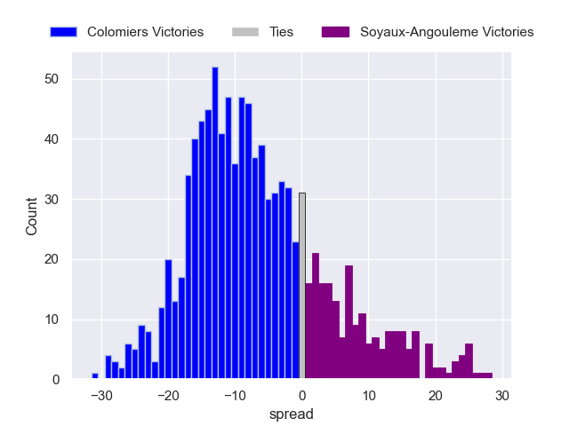 Each club has a rating and a rating deviation (similar to a Glicko rating), and expected performances can be generated. This allows for simulated matches and spreads like the ones below.