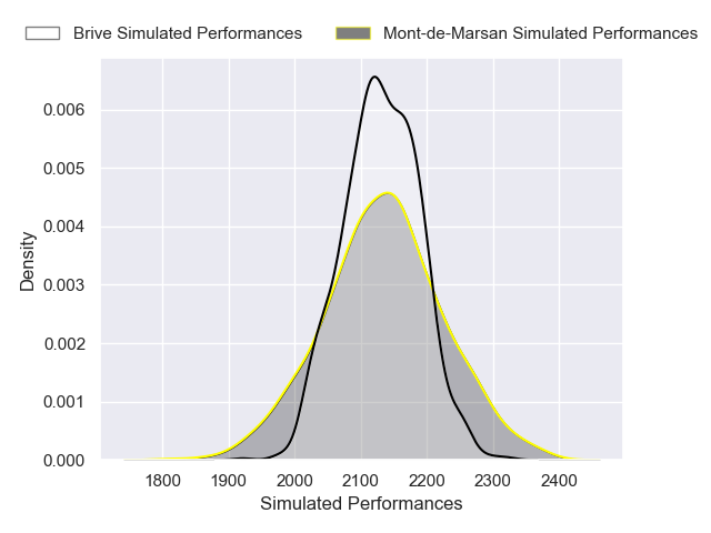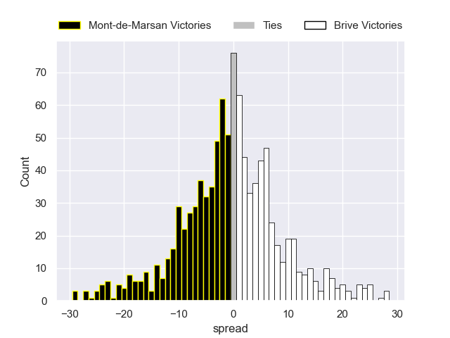 Each club has a rating and a rating deviation (similar to a Glicko rating), and expected performances can be generated. This allows for simulated matches and spreads like the ones below.