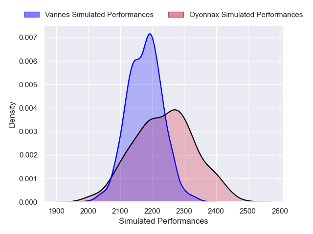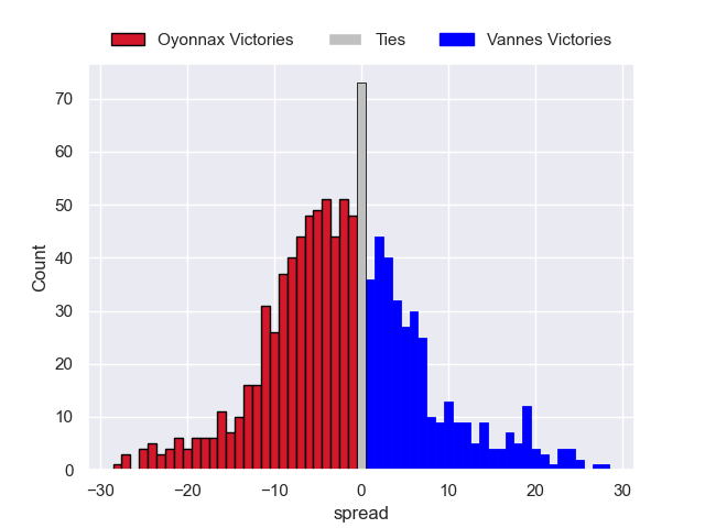 Each club has a rating and a rating deviation (similar to a Glicko rating), and expected performances can be generated. This allows for simulated matches and spreads like the ones below.