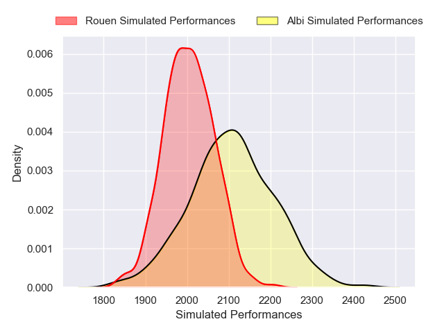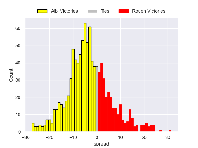 Each club has a rating and a rating deviation (similar to a Glicko rating), and expected performances can be generated. This allows for simulated matches and spreads like the ones below.