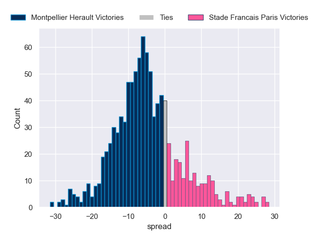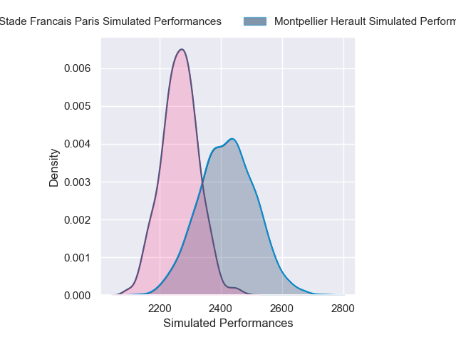 Each club has a rating and a rating deviation (similar to a Glicko rating), and expected performances can be generated. This allows for simulated matches and spreads like the ones below.