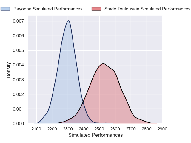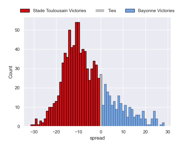 Each club has a rating and a rating deviation (similar to a Glicko rating), and expected performances can be generated. This allows for simulated matches and spreads like the ones below.