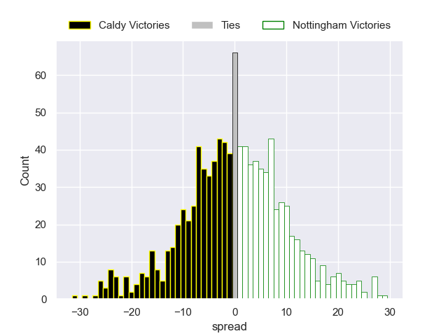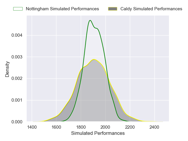 Each club has a rating and a rating deviation (similar to a Glicko rating), and expected performances can be generated. This allows for simulated matches and spreads like the ones below.