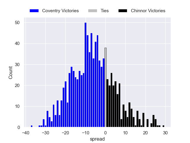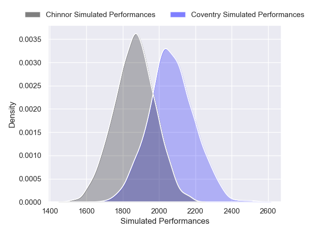 Each club has a rating and a rating deviation (similar to a Glicko rating), and expected performances can be generated. This allows for simulated matches and spreads like the ones below.