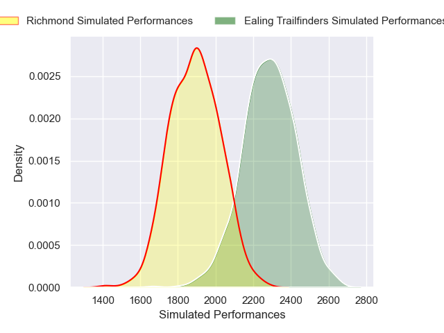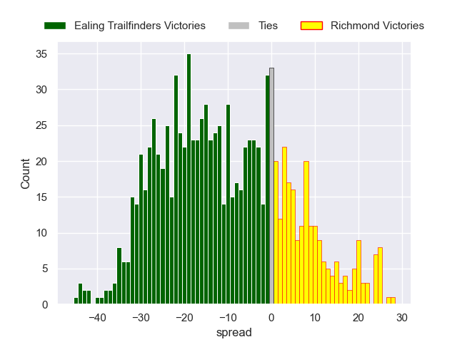 Each club has a rating and a rating deviation (similar to a Glicko rating), and expected performances can be generated. This allows for simulated matches and spreads like the ones below.