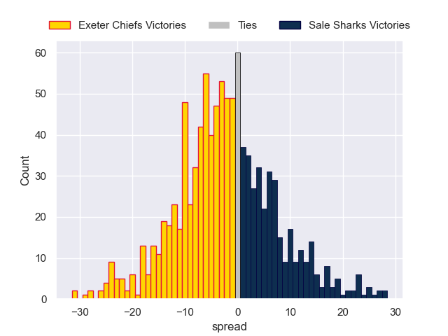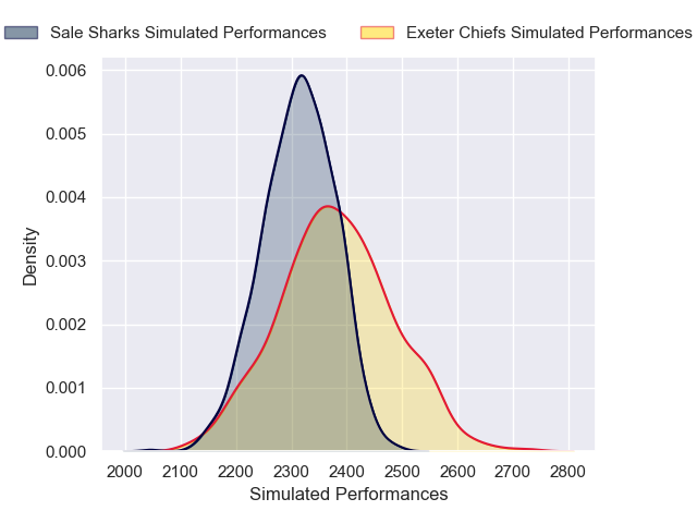 Each club has a rating and a rating deviation (similar to a Glicko rating), and expected performances can be generated. This allows for simulated matches and spreads like the ones below.