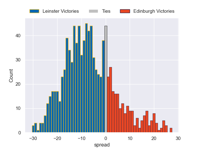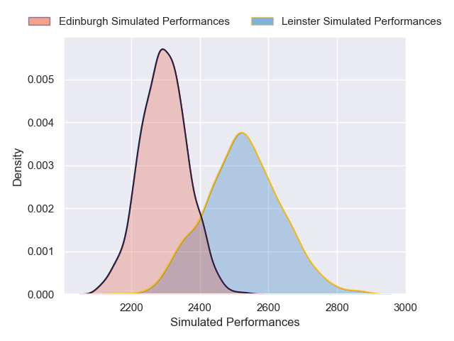 Each club has a rating and a rating deviation (similar to a Glicko rating), and expected performances can be generated. This allows for simulated matches and spreads like the ones below.