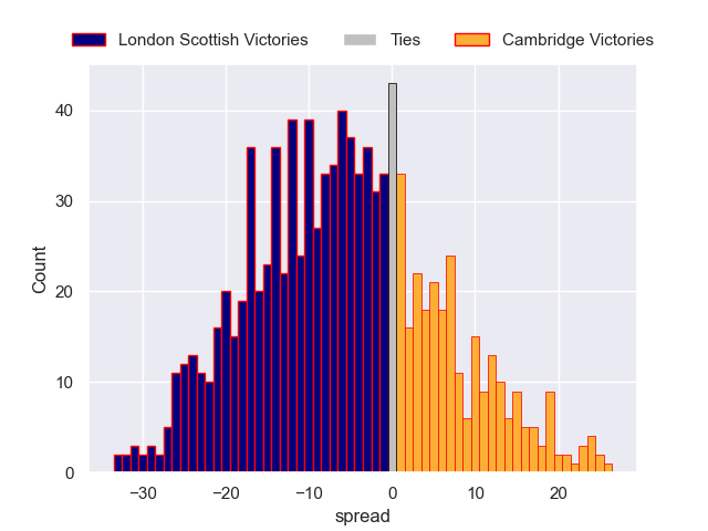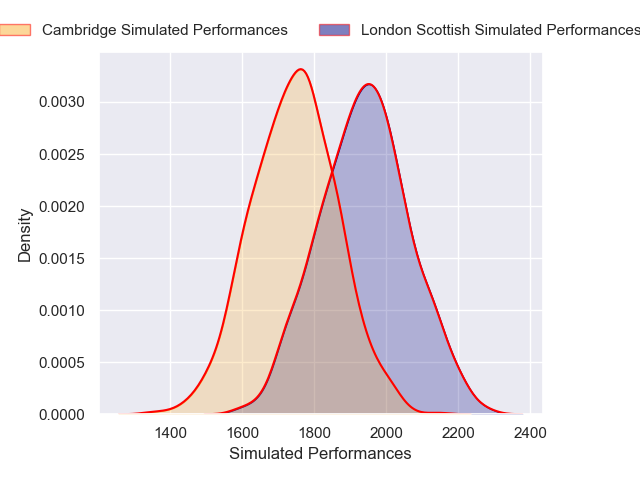Each club has a rating and a rating deviation (similar to a Glicko rating), and expected performances can be generated. This allows for simulated matches and spreads like the ones below.