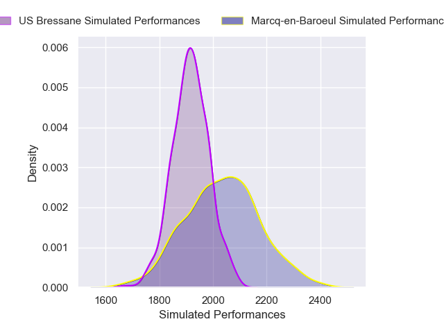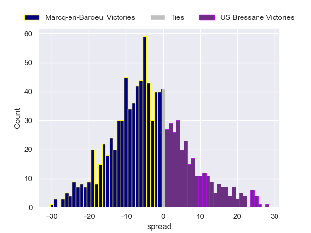 Each club has a rating and a rating deviation (similar to a Glicko rating), and expected performances can be generated. This allows for simulated matches and spreads like the ones below.