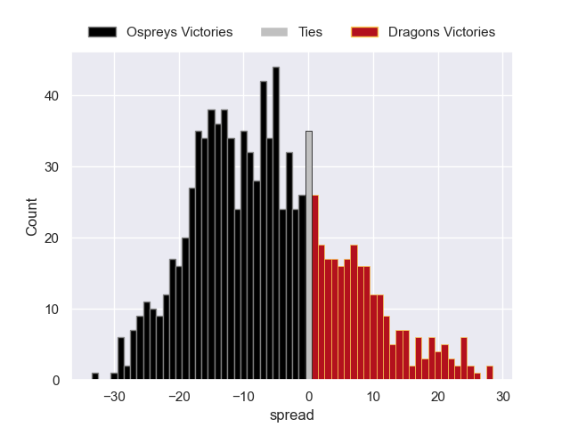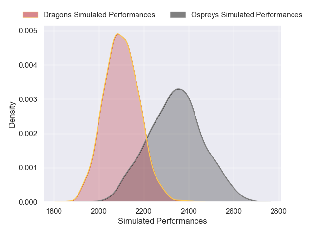 Each club has a rating and a rating deviation (similar to a Glicko rating), and expected performances can be generated. This allows for simulated matches and spreads like the ones below.