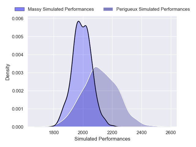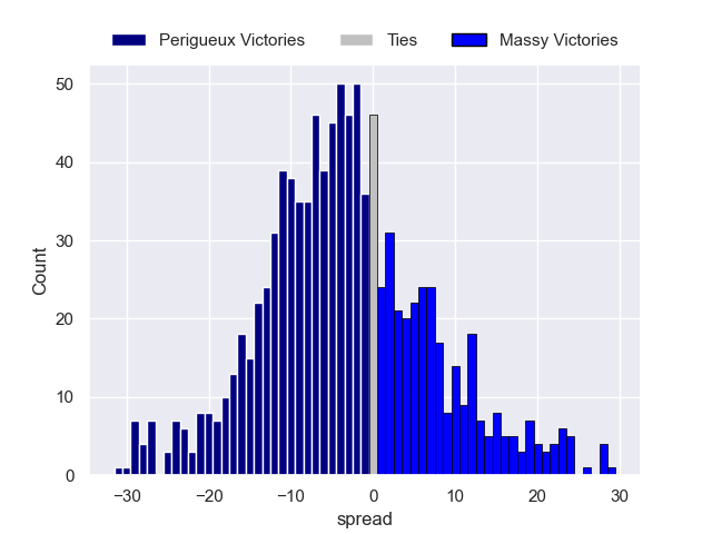Each club has a rating and a rating deviation (similar to a Glicko rating), and expected performances can be generated. This allows for simulated matches and spreads like the ones below.