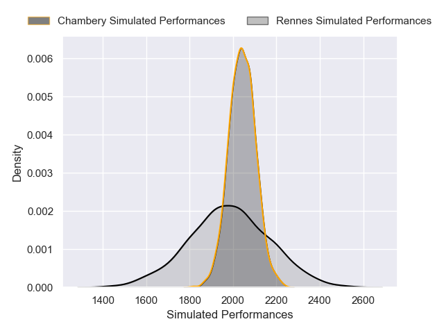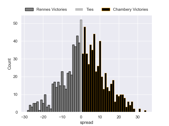 Each club has a rating and a rating deviation (similar to a Glicko rating), and expected performances can be generated. This allows for simulated matches and spreads like the ones below.