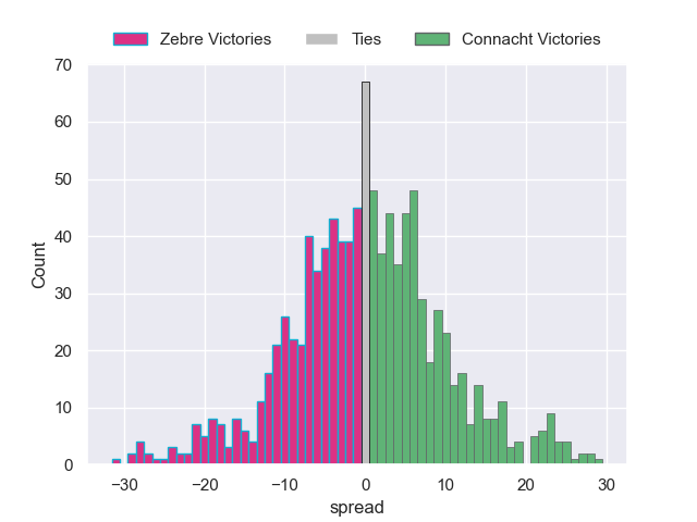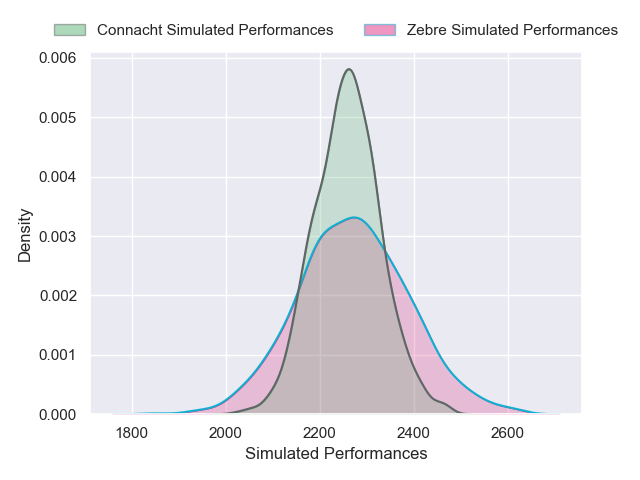 Each club has a rating and a rating deviation (similar to a Glicko rating), and expected performances can be generated. This allows for simulated matches and spreads like the ones below.