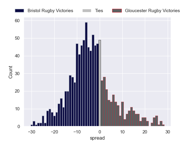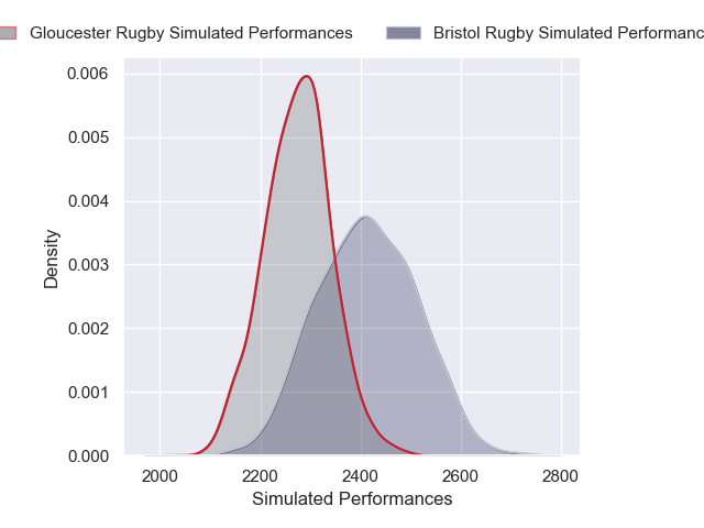 Each club has a rating and a rating deviation (similar to a Glicko rating), and expected performances can be generated. This allows for simulated matches and spreads like the ones below.