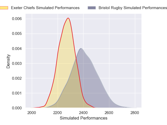 Each club has a rating and a rating deviation (similar to a Glicko rating), and expected performances can be generated. This allows for simulated matches and spreads like the ones below.
