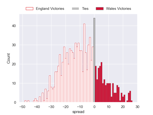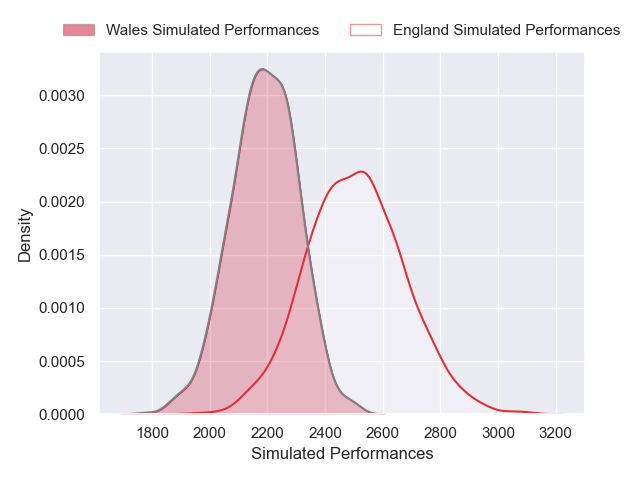 Each club has a rating and a rating deviation (similar to a Glicko rating), and expected performances can be generated. This allows for simulated matches and spreads like the ones below.