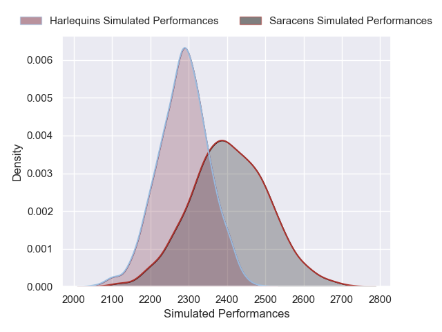 Each club has a rating and a rating deviation (similar to a Glicko rating), and expected performances can be generated. This allows for simulated matches and spreads like the ones below.