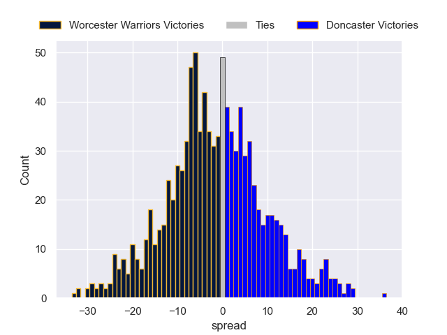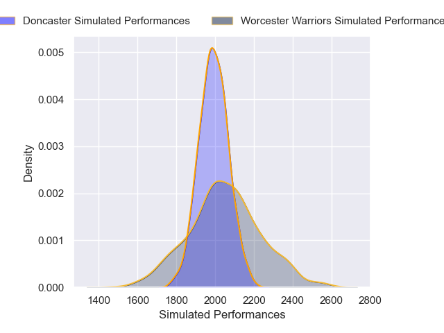 Each club has a rating and a rating deviation (similar to a Glicko rating), and expected performances can be generated. This allows for simulated matches and spreads like the ones below.