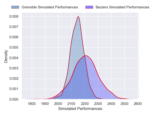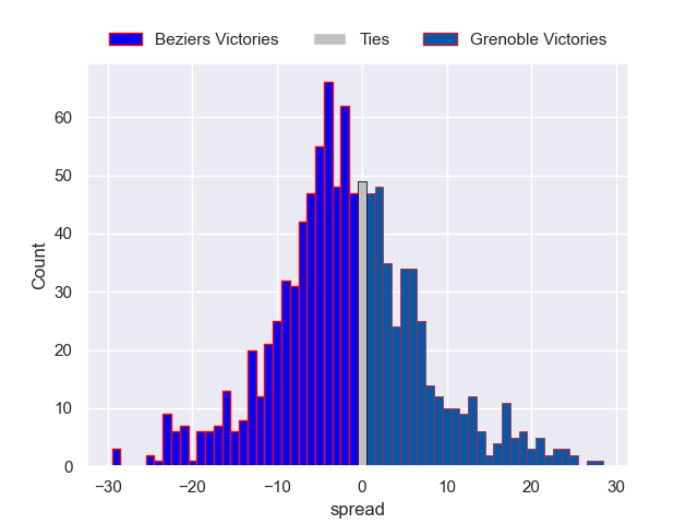 Each club has a rating and a rating deviation (similar to a Glicko rating), and expected performances can be generated. This allows for simulated matches and spreads like the ones below.