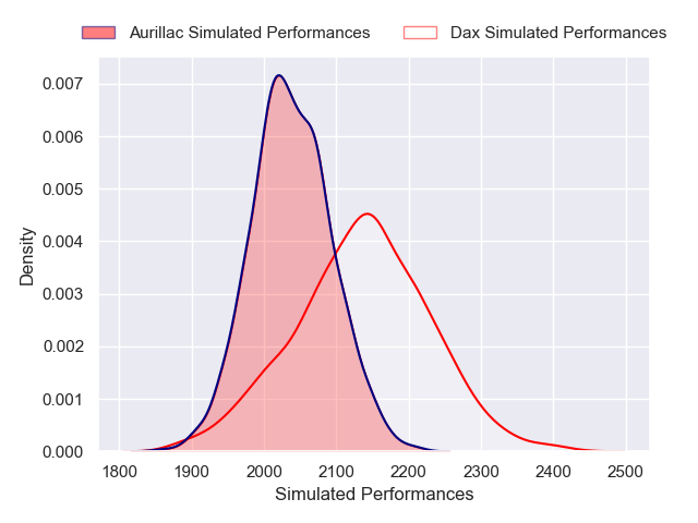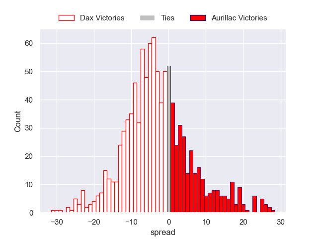 Each club has a rating and a rating deviation (similar to a Glicko rating), and expected performances can be generated. This allows for simulated matches and spreads like the ones below.