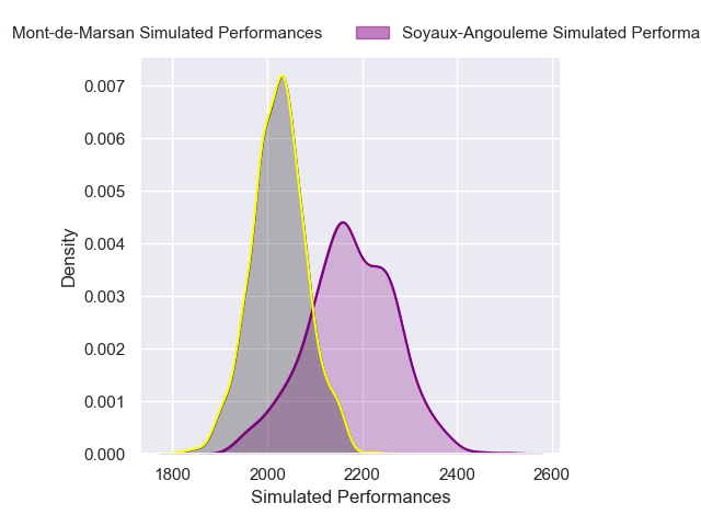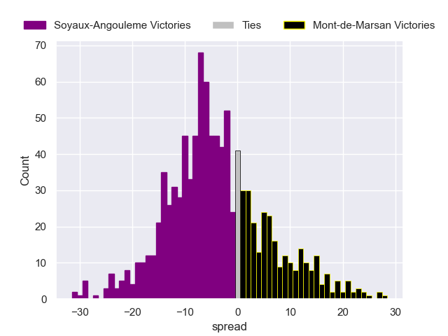Each club has a rating and a rating deviation (similar to a Glicko rating), and expected performances can be generated. This allows for simulated matches and spreads like the ones below.