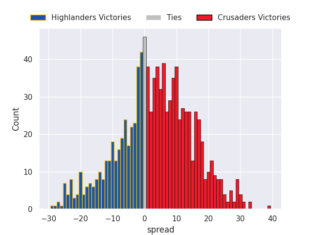 Each club has a rating and a rating deviation (similar to a Glicko rating), and expected performances can be generated. This allows for simulated matches and spreads like the ones below.