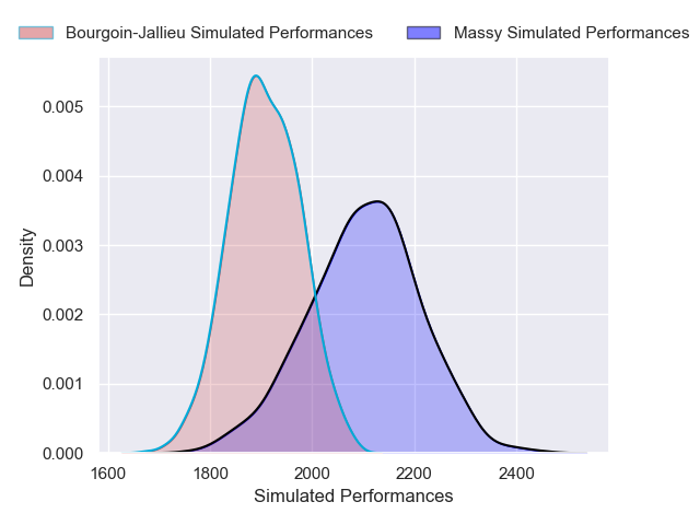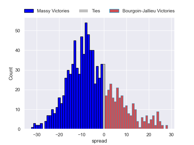 Each club has a rating and a rating deviation (similar to a Glicko rating), and expected performances can be generated. This allows for simulated matches and spreads like the ones below.