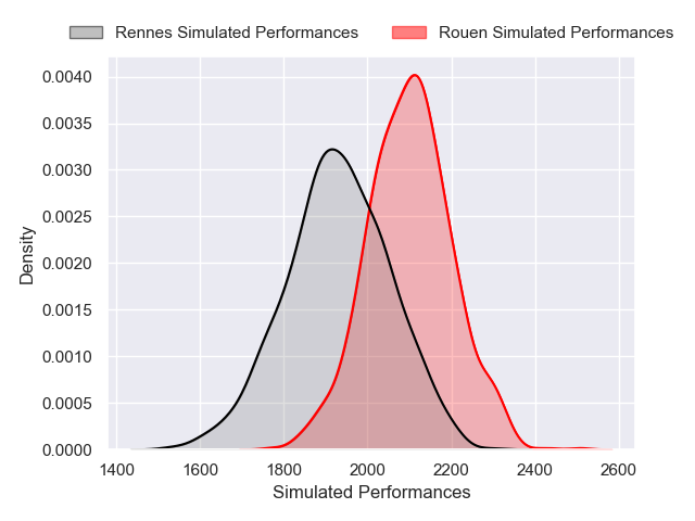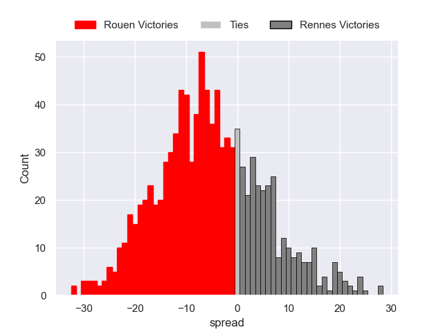 Each club has a rating and a rating deviation (similar to a Glicko rating), and expected performances can be generated. This allows for simulated matches and spreads like the ones below.