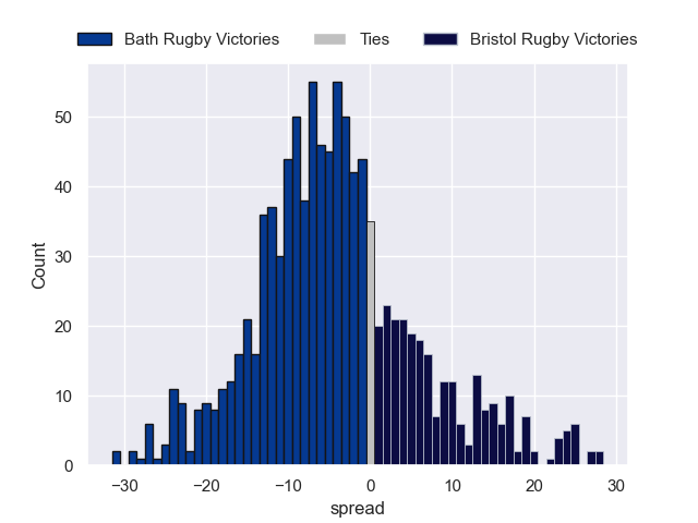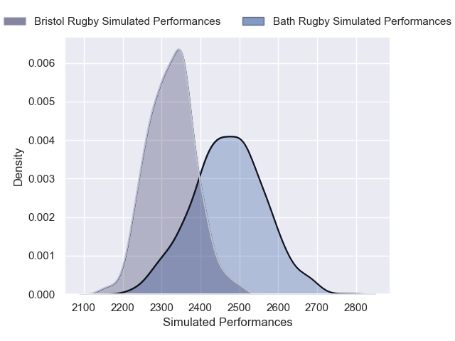 Each club has a rating and a rating deviation (similar to a Glicko rating), and expected performances can be generated. This allows for simulated matches and spreads like the ones below.