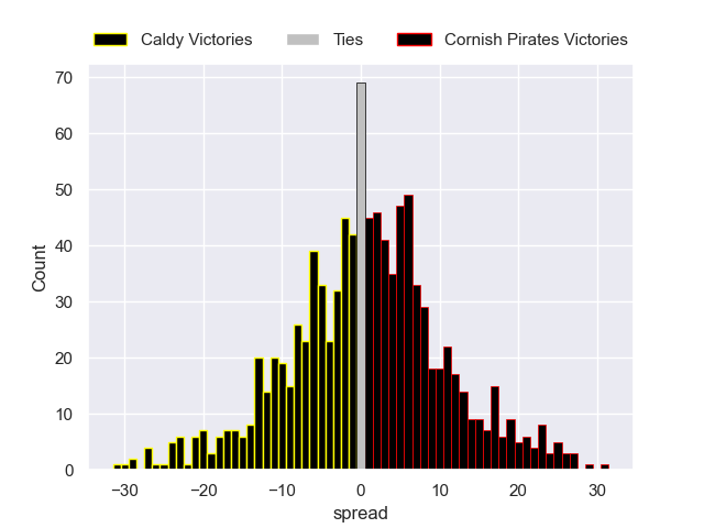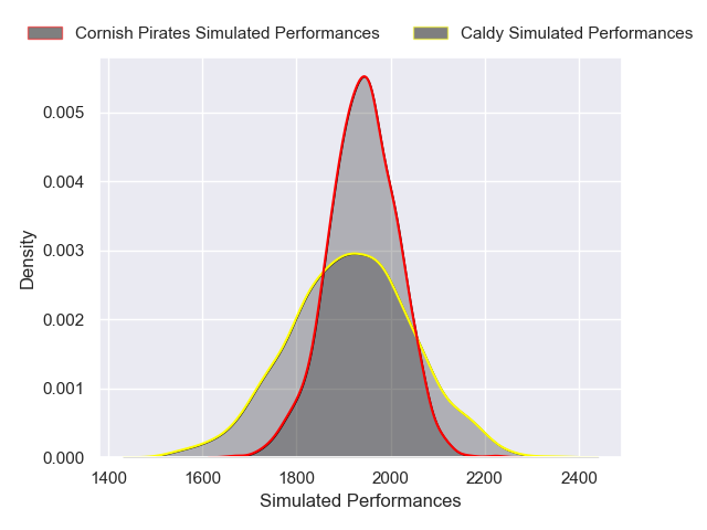 Each club has a rating and a rating deviation (similar to a Glicko rating), and expected performances can be generated. This allows for simulated matches and spreads like the ones below.