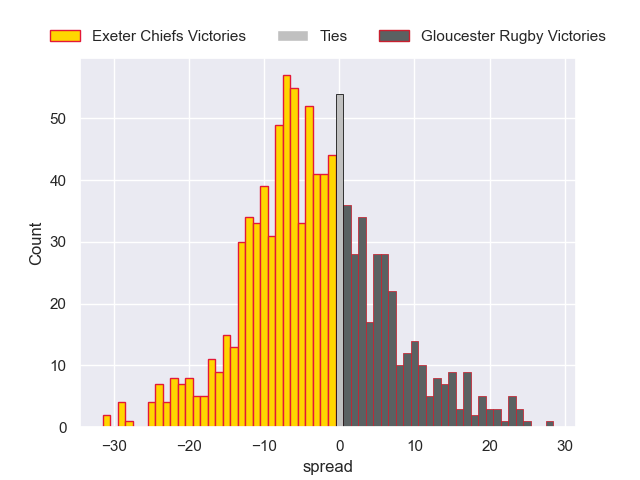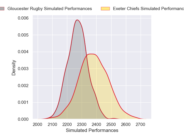 Each club has a rating and a rating deviation (similar to a Glicko rating), and expected performances can be generated. This allows for simulated matches and spreads like the ones below.