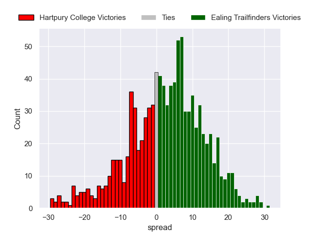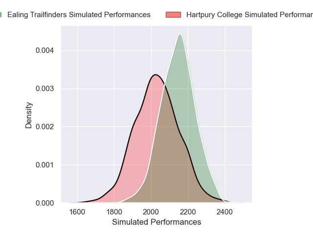 Each club has a rating and a rating deviation (similar to a Glicko rating), and expected performances can be generated. This allows for simulated matches and spreads like the ones below.