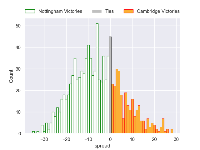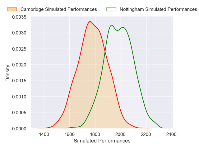 Each club has a rating and a rating deviation (similar to a Glicko rating), and expected performances can be generated. This allows for simulated matches and spreads like the ones below.