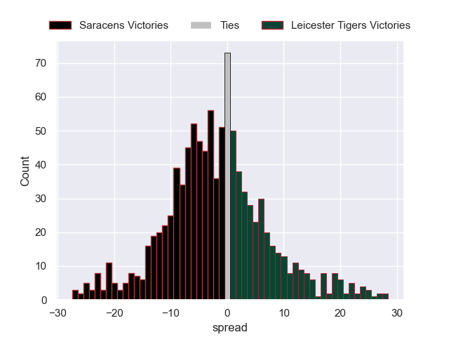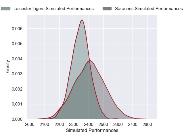 Each club has a rating and a rating deviation (similar to a Glicko rating), and expected performances can be generated. This allows for simulated matches and spreads like the ones below.