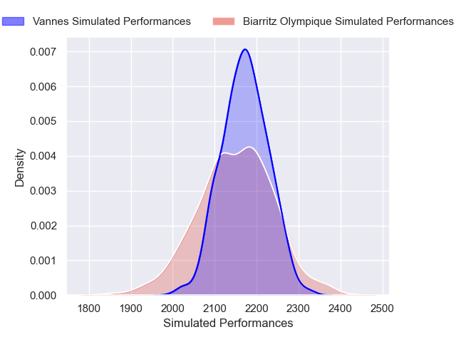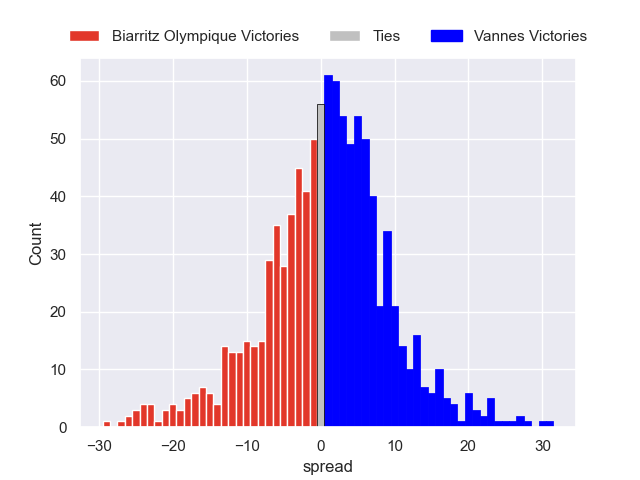 Each club has a rating and a rating deviation (similar to a Glicko rating), and expected performances can be generated. This allows for simulated matches and spreads like the ones below.