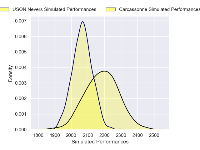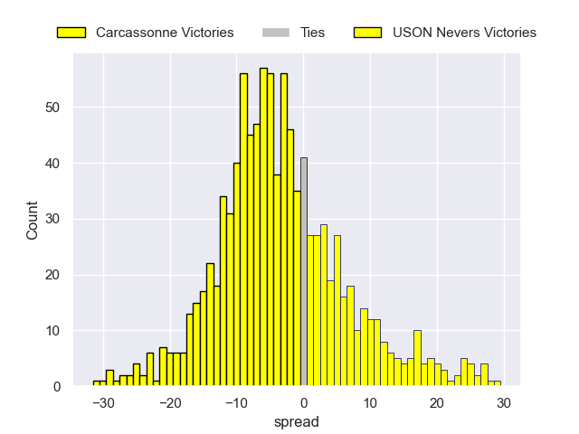 Each club has a rating and a rating deviation (similar to a Glicko rating), and expected performances can be generated. This allows for simulated matches and spreads like the ones below.