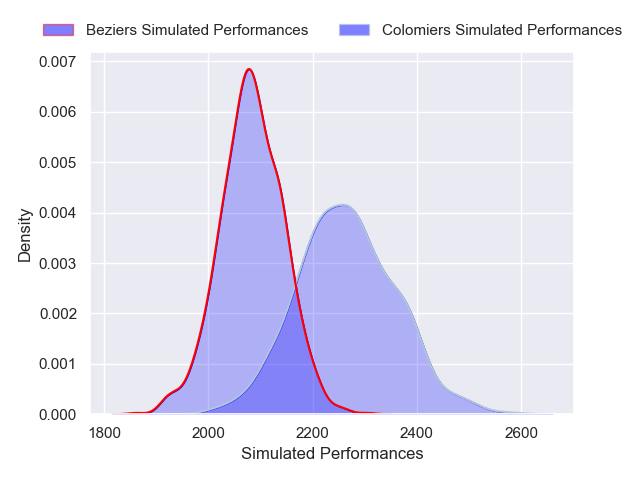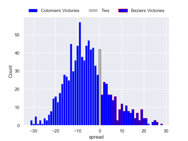 Each club has a rating and a rating deviation (similar to a Glicko rating), and expected performances can be generated. This allows for simulated matches and spreads like the ones below.