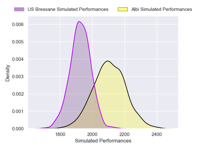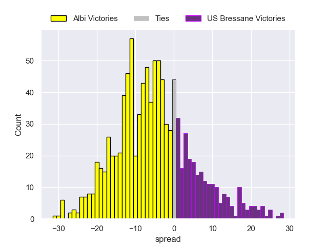 Each club has a rating and a rating deviation (similar to a Glicko rating), and expected performances can be generated. This allows for simulated matches and spreads like the ones below.