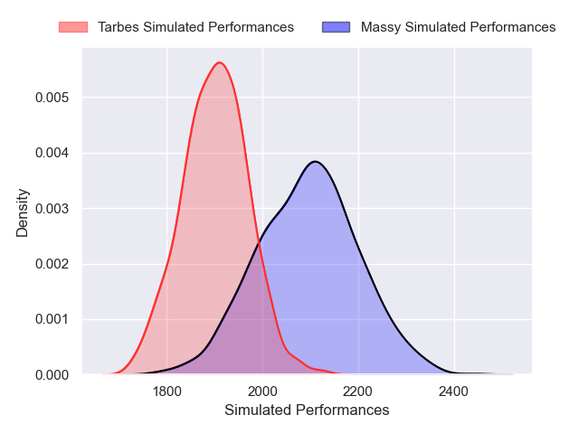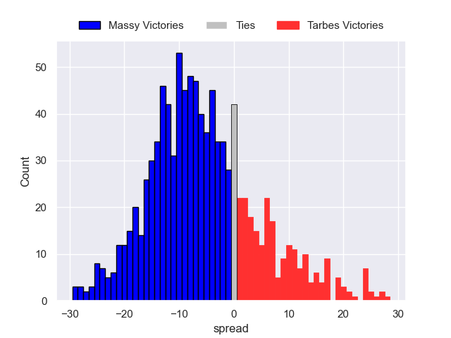 Each club has a rating and a rating deviation (similar to a Glicko rating), and expected performances can be generated. This allows for simulated matches and spreads like the ones below.