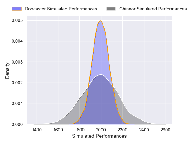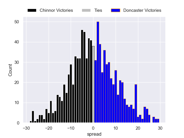 Each club has a rating and a rating deviation (similar to a Glicko rating), and expected performances can be generated. This allows for simulated matches and spreads like the ones below.