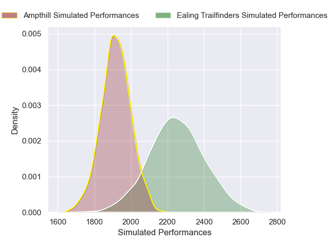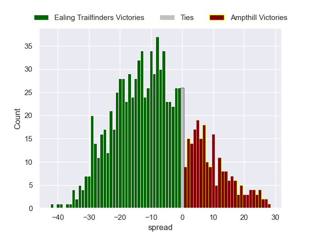Each club has a rating and a rating deviation (similar to a Glicko rating), and expected performances can be generated. This allows for simulated matches and spreads like the ones below.