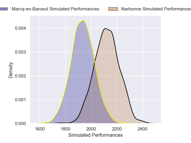 Each club has a rating and a rating deviation (similar to a Glicko rating), and expected performances can be generated. This allows for simulated matches and spreads like the ones below.