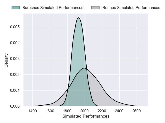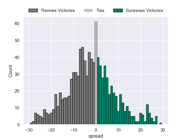 Each club has a rating and a rating deviation (similar to a Glicko rating), and expected performances can be generated. This allows for simulated matches and spreads like the ones below.