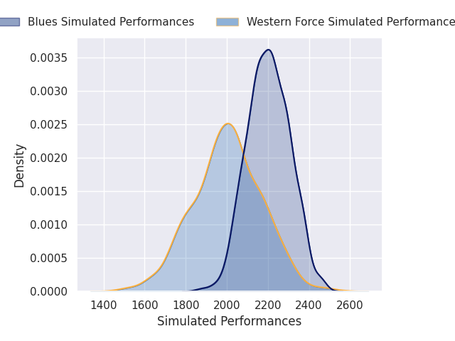 Each club has a rating and a rating deviation (similar to a Glicko rating), and expected performances can be generated. This allows for simulated matches and spreads like the ones below.