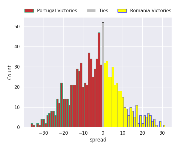 The first set of predictions treats a club as the smallest object, as the club develops its members, organizes a gameplan, and deploys its players as needed for each match. This club model is currently predicting Portugal to win by 3.92.